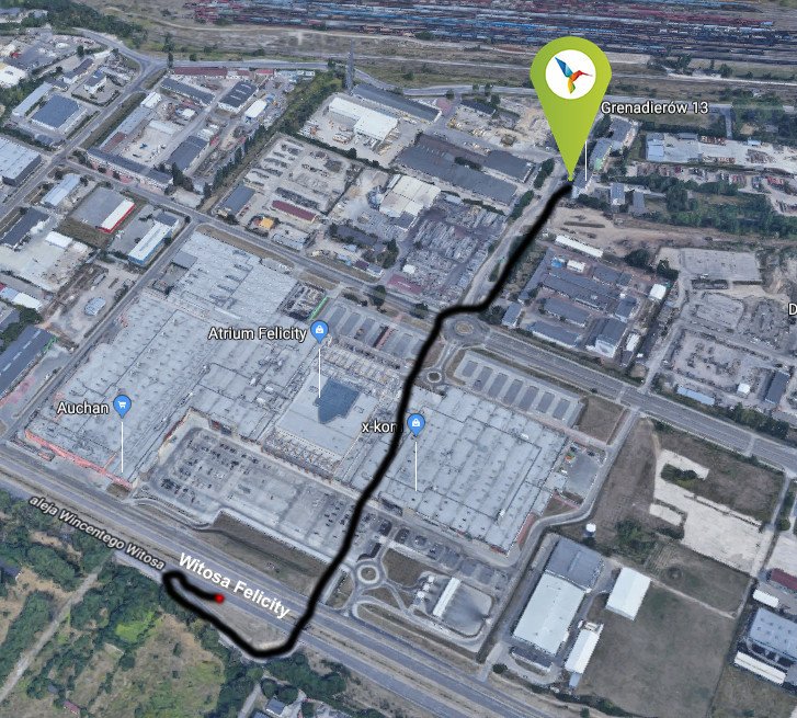 W sąsiedztwie Centrum Rozwiązań Biznesowych zlokalizowanych jest kilka przystanków MPK „Grenadierów”, „Pancerniaków” oraz „Witosa Felicity” na które bezpośrednio dojeżdzają linie: 1, 7, 14, 50, 55 i 153.